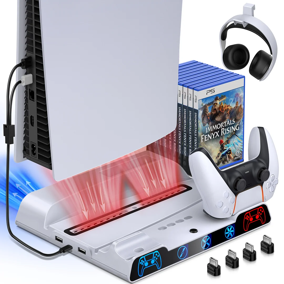 The PS5 stand mixes multiple functions into one. This PS5 vertical stand design for PS5 digital edition and PS5 Ultra HD. With 2 coolings fans,2 controller charger pork, 4 USB dongles, headphone stand and a flexible 10 game slots. This PS5 controller charger station is prepared for all game lovers.