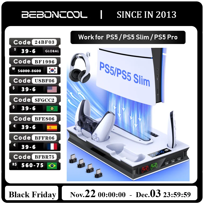 BEBONCOOL S5000 Vertical Stand For PlayStation 5 New Slim Version PS5 Cooling Station with Two Dual Fast Charging USB