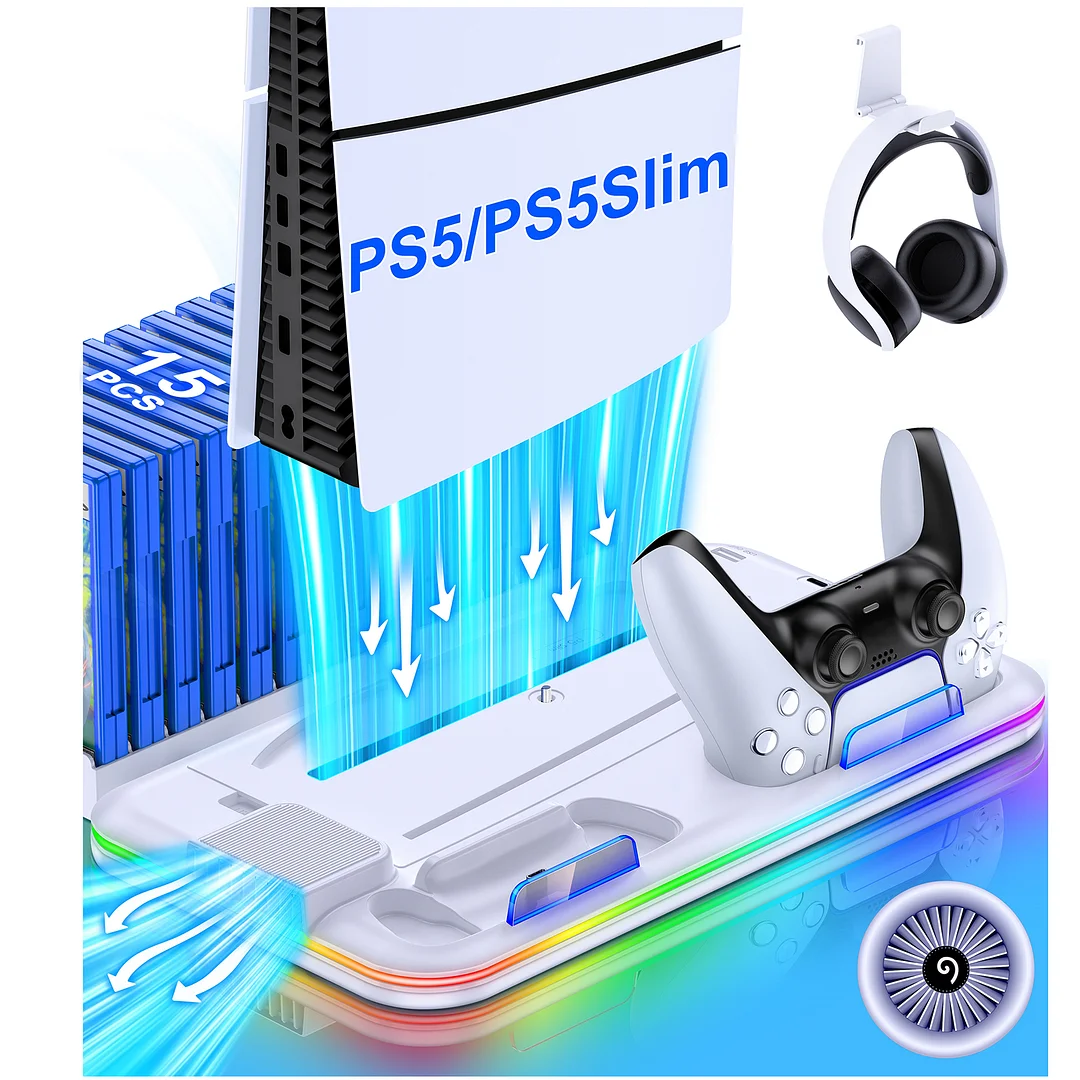 🌀 【WHAT YOU GET & CUSTOMER SERVICE】 1X PS5 Stand with Cooling Fan and Controller Charger; 1X 15 Game Slots; 1X 9.06Inch C to C Charging Cable; 1X PS5 Slim Panel; 1X PS5 Disc/Digital Panel; 1X Headset/Controller Holder; 1X Screw; 1X User Manual. We are dedicated to providing customers with the best products and services. Please feel free to contact us if any problems. TIPS:The PS5 cooling station has a memory function. The last wind speed setting will be maintained when turned on again.
