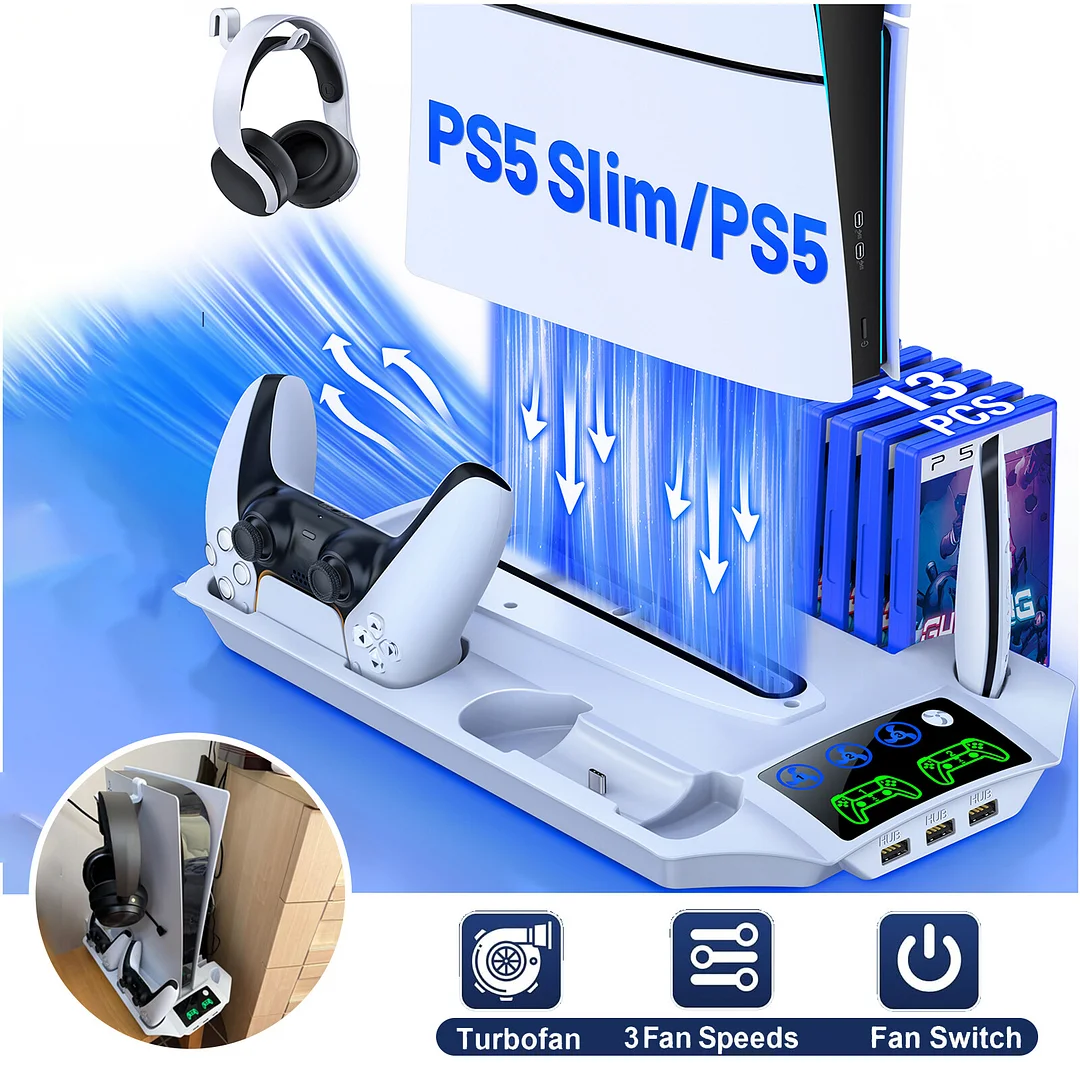 🌀 【NEWEST COOLING STATION FOR PS5 CONSOLE】 The high speed PS5 cooling fan has 3 adjustable gears: Strong/Medium/Normal. Playstation 5 accessories PS5 fan pulls out hot air from console bottom and efficiently dissipate heat from right side, so PS5 fan cooling fan will keep your PS5 console cooling without noise, enhance your gaming experience. No need to worry about console overheating from playing games all day and night! PS5 cooling station will maximize the life of your game console.