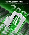 Features short-circuit, overcharge, overcurrent, and overheating protection, with a lifespan of 2000+ recharges. The LED indicator shows charging status: Red for charging, Green for fully charged.